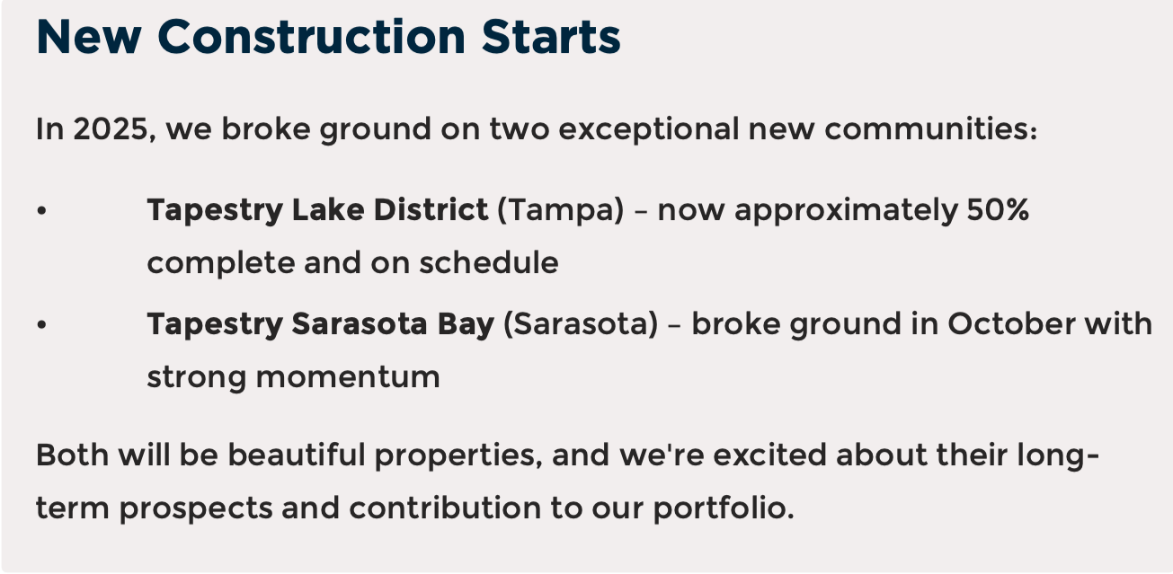 We're optimistic that 2026 will be a strong year for apartment fundamentals and therefore a strong year for development. Market conditions are improving, construction pipelines are moderating, and demand remains robust across our target markets.